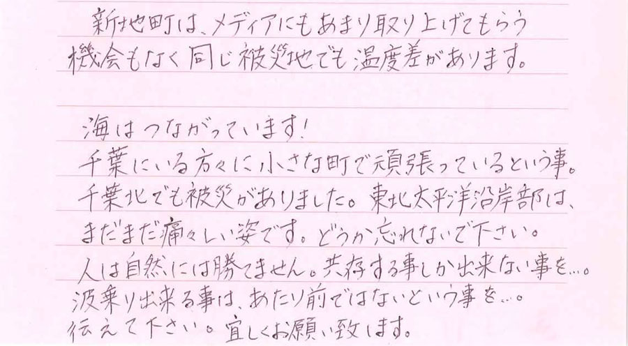 6月 11 2014 3年と3ヶ月 東日本大震災から今日は3年と3ヶ月目となりました。画像は先月末、福島県新地町の仮設住宅から届いたステッカーです。まだまだ復興の道半ばということを忘れないようにしたいと思います。ステッカーに添えられたメッセージもぜひお読み下さい。 波乗りできる環境に感謝の気持ちを忘れないようにしたいですね。そして、復興がもっと進むようにお手伝いしたいと思います。