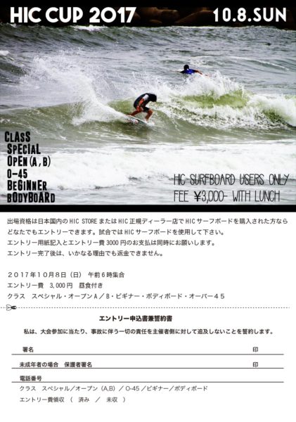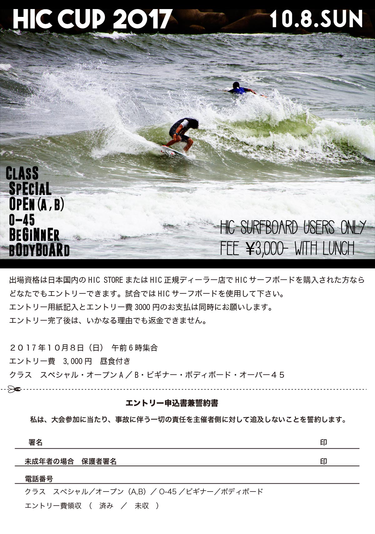 9月 20 2017 HIC CUP 2017 10/8(日) エントリー受付開始! 今年もやります!HIC CUP! 10月8日(日)です! エントリー受付開始〜 クラスは ・スペシャル ・オープン(A,B) ・ビギナー ・O-45 ・ボディボード エントリー費 3,000円 お弁当付き 全国のHICユーザー様 エントリーお待ちしております!