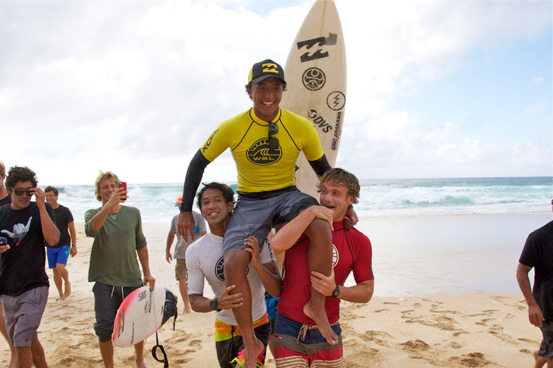 決勝ヒート終了5秒前に決めたバックサイド360°フルローテーションエアーで得た7ポイントで親友でもあるBenji Brandをおさえての逆転優勝でした。
